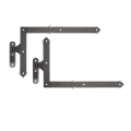 Kit de charnières d'angle décoratives à gond destinées au montage de grandes portes, portillons et portails — particulièrement dans les bâtiments agricoles et objets de caractère traditionnel. Le kit contient deux charnières (supérieure et inférieure) pour un vantail, ce qui permet un équipement complet de l'ouverture de montage dans le cadre d'une seule commande.