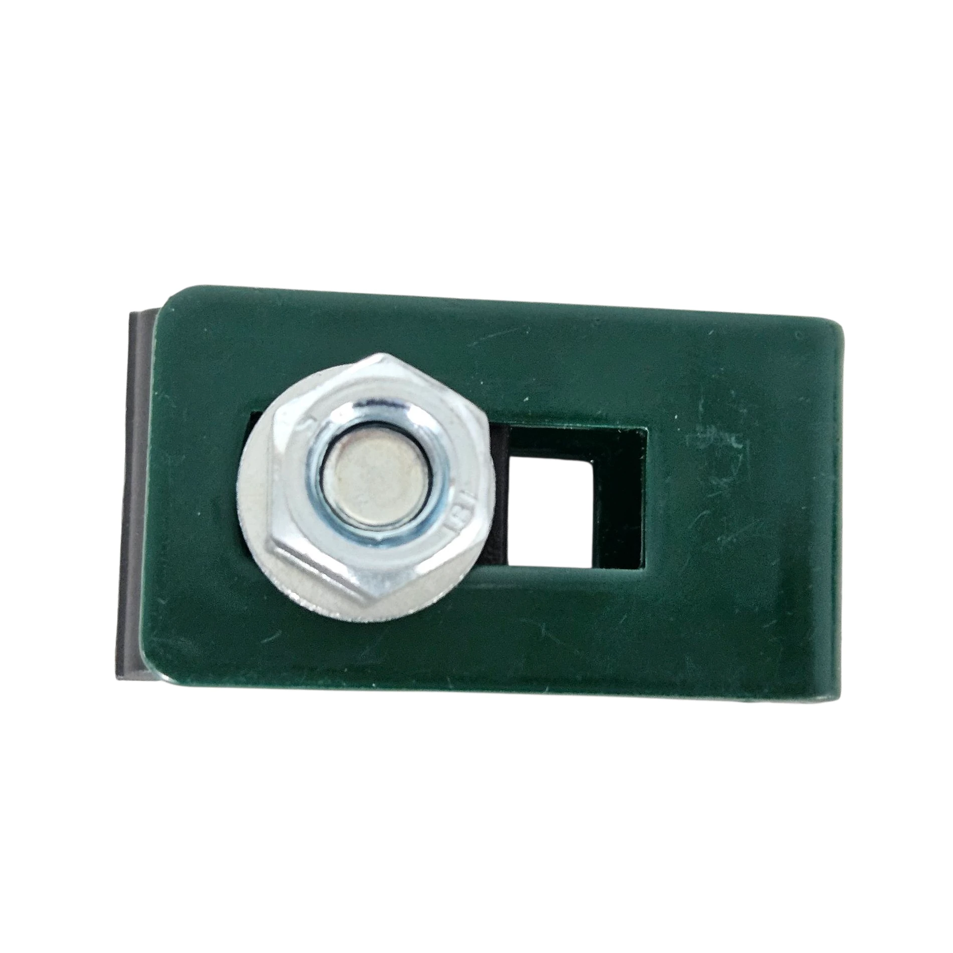 Collier universel support raccord pour panneaux de clôture vert conçu pour poteaux de différentes sections grâce à sa forme universelle.
