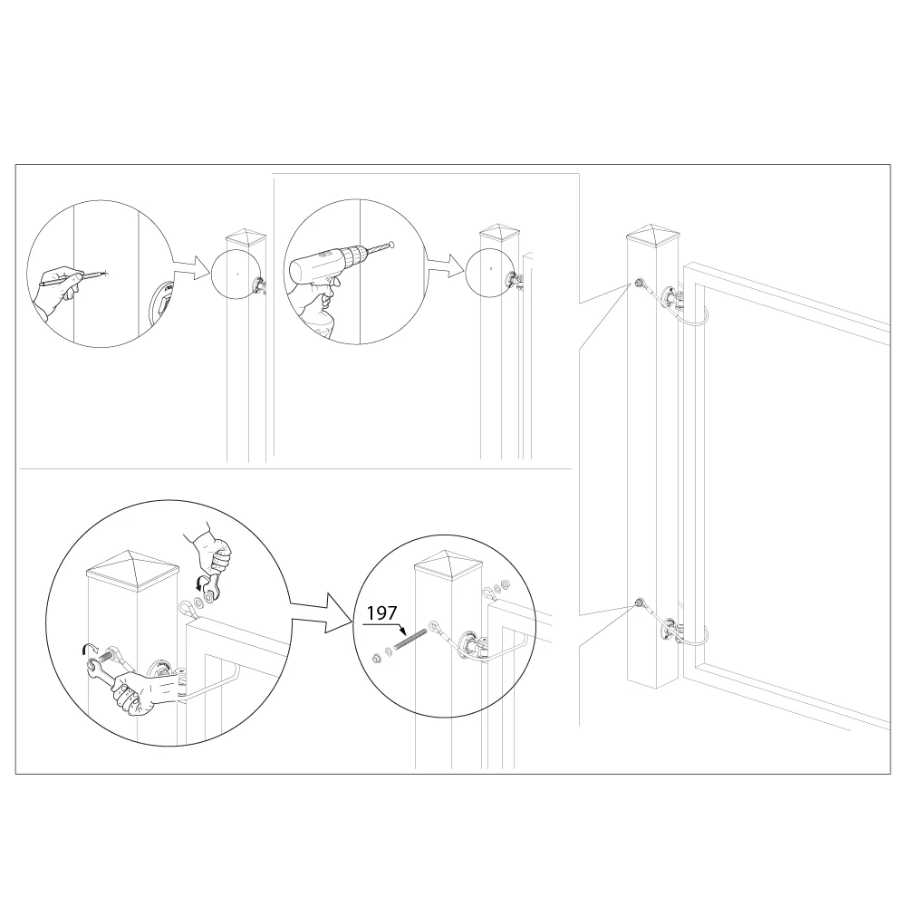 Le câble se monte entre le poteau et le vantail du portail. Une extrémité est fixée au poteau de clôture, l'autre au châssis du vantail. Le montage nécessite de percer des trous dans le poteau et le vantail, puis de visser les supports avec des vis. Les cosses facilitent l'accrochage aux vis à œillet ou aux manilles — tout le processus est rapide et ne nécessite pas d'outils spécialisés.