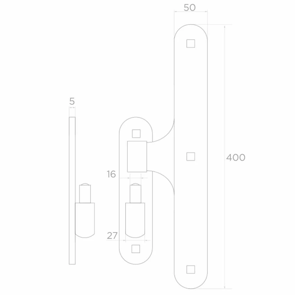 La paumelle centrale est montée sur la suspension centrale du vantail du portail, assurant une répartition uniforme de la charge. Les trous de fixation carrés permettent l'utilisation de vis antivol qui ne dépassent pas de la surface de la platine et empêchent le dévissage non autorisé depuis l'extérieur. C'est une solution pratique qui améliore à la fois l'esthétique et la sécurité du montage.