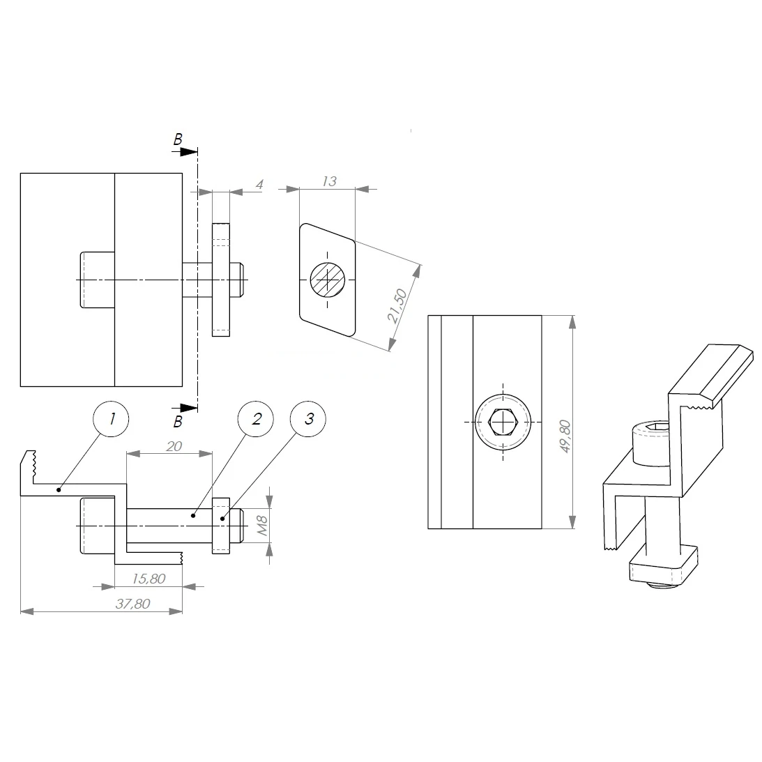 Collier de serrage latéral 35 mm avec vis et insert en aluminium 6060, pour le montage de modules photovoltaïques 35 mm avec vis DIN 912 M8x25.